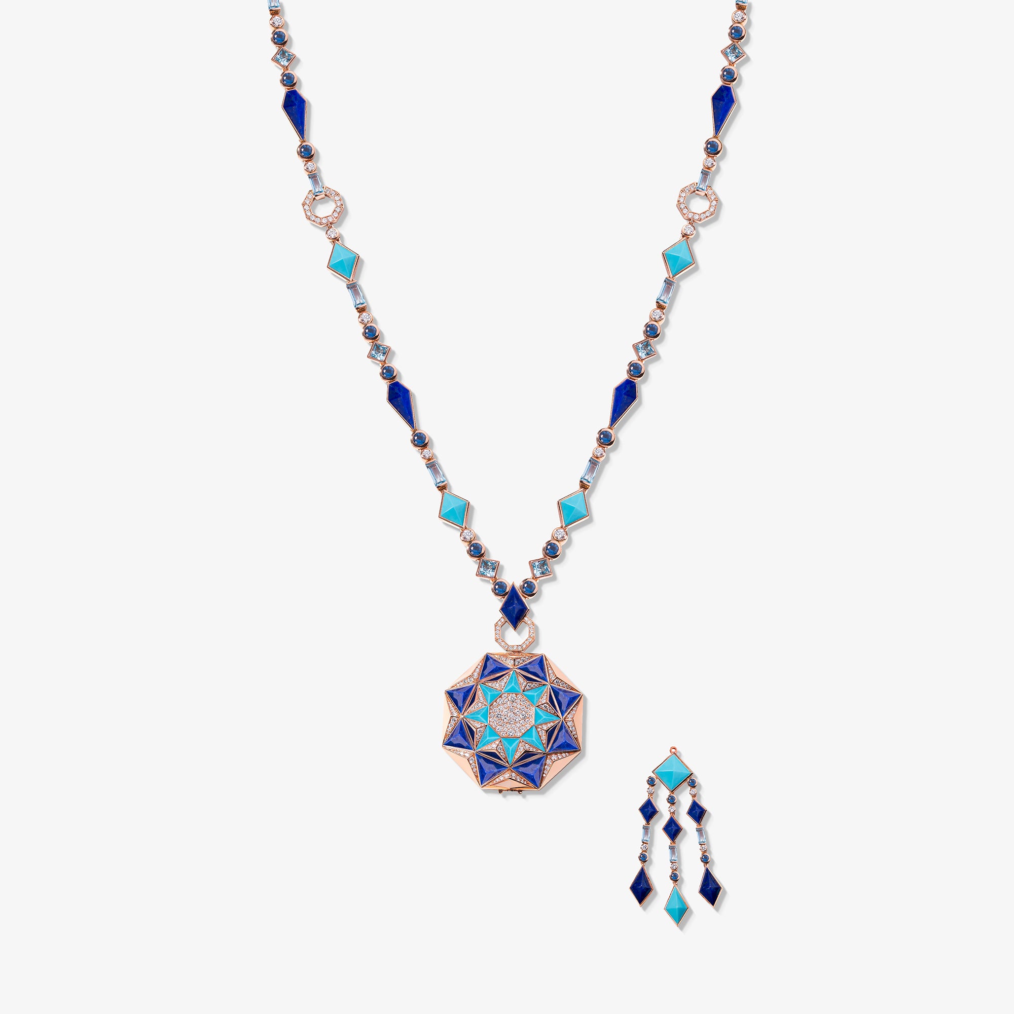 قلادة مثمّنة الأضلاع تضم عددًا من الماسات الباهرة التي تتجاور مع ياقوت أزرق، وتوباز