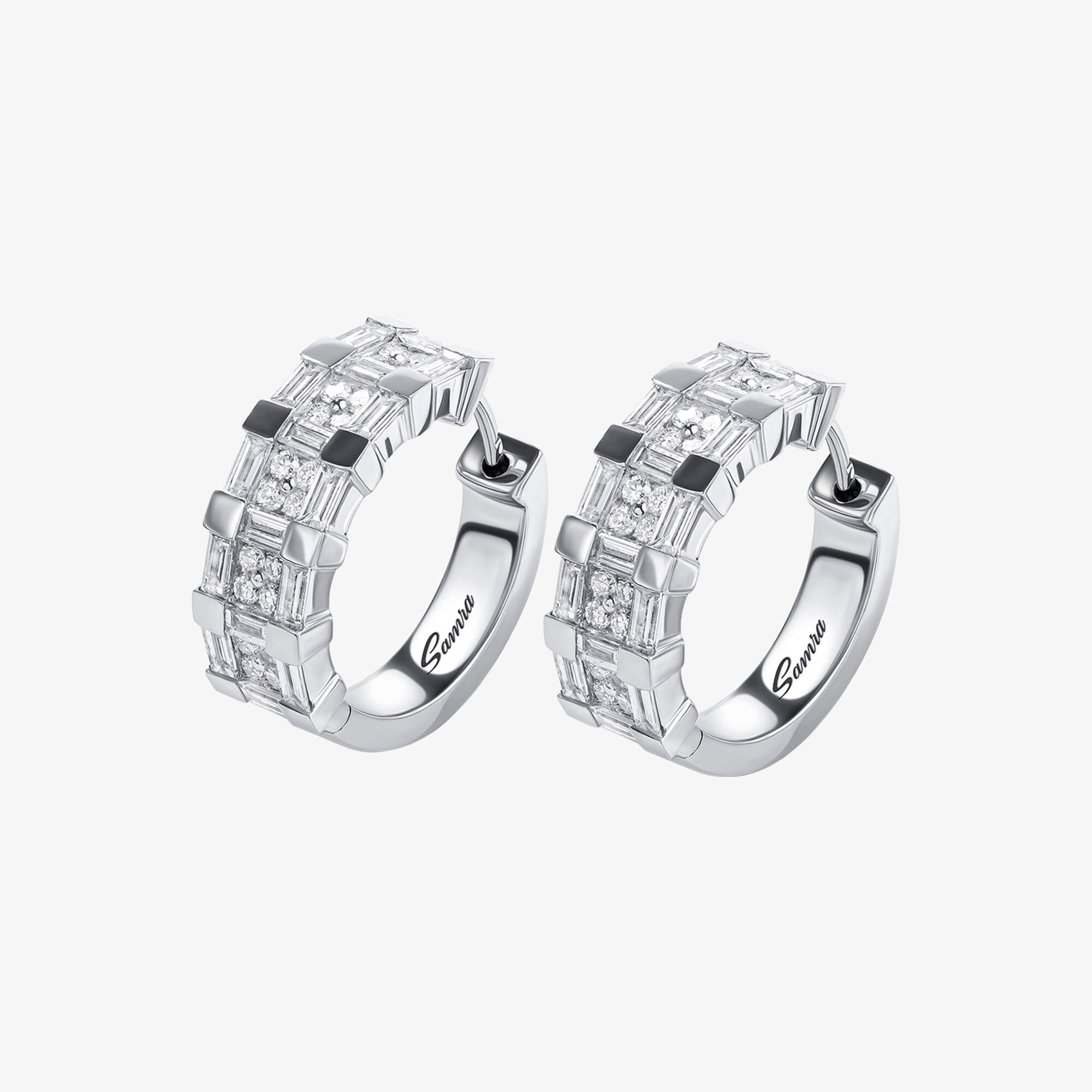 صُمّم هذا الحلق من الذهب الأبيض عيار 18 قيراط، ومن ماسات لامعة يبلغ وزنها 0.345 قيراط، ومن ماسات مقطعة بالطول بوزن 0.894.