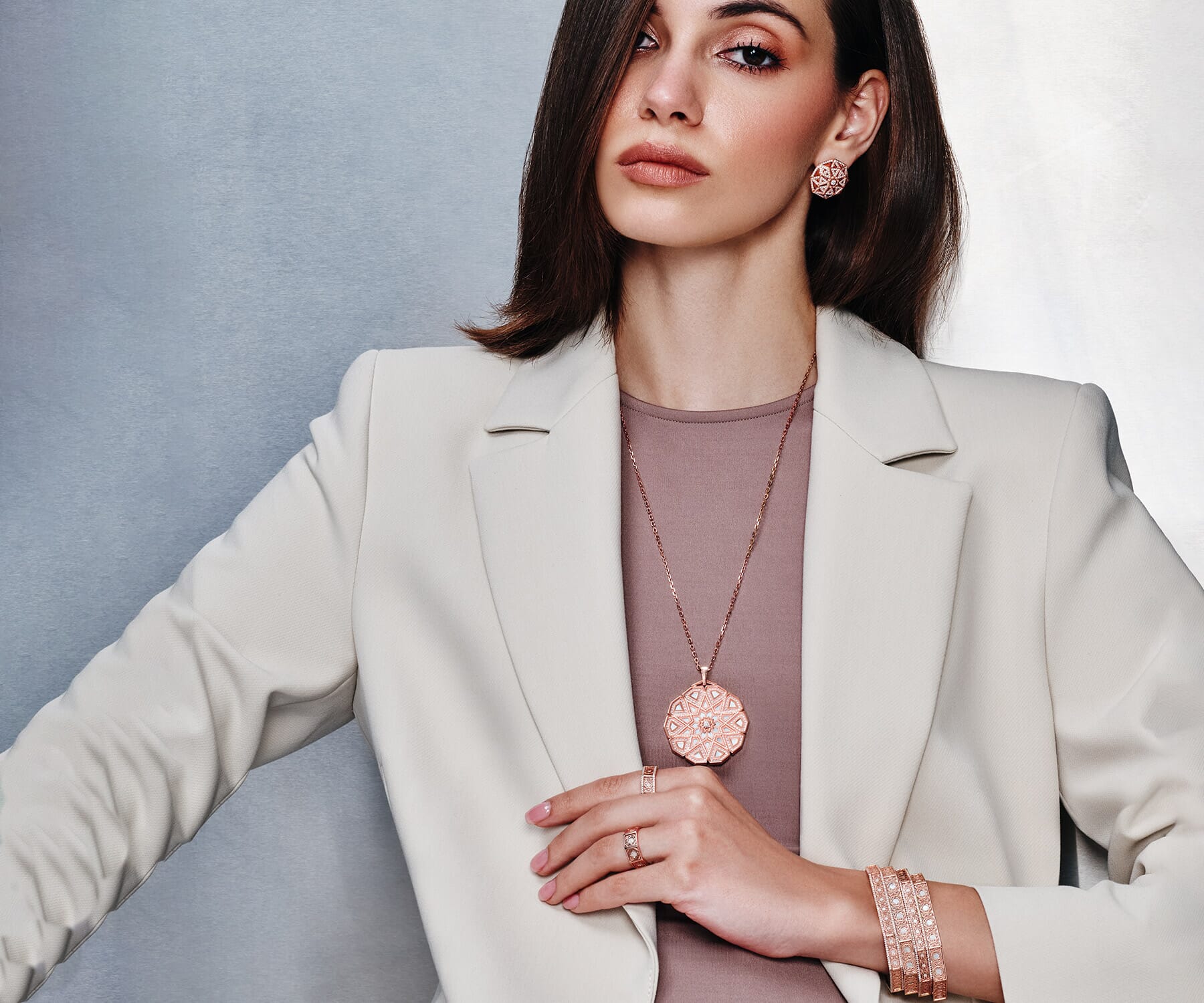 أطلقي قوتك، رغباتك، أحلامك وطموحاتك مع مجموعة مفتاح تراث. مجموعة مستوحاة من المفاتيح التقليدية التي كانت تستخدم في المنطقة والتي تحمل إرث التصاميم العربية القديمة مجسّدة الفنّ العربيخير تجسيد. ومن هنا، جاءت مجموعة تراث لتشكّل حجاباُ يفتح العوالم الخفية، إذ تجسّد تصاميم هذه المجموعة الحرية والاحتفال باللحظات الثمينة. مجموعة تراث هي مفتاح القلب والجوهر