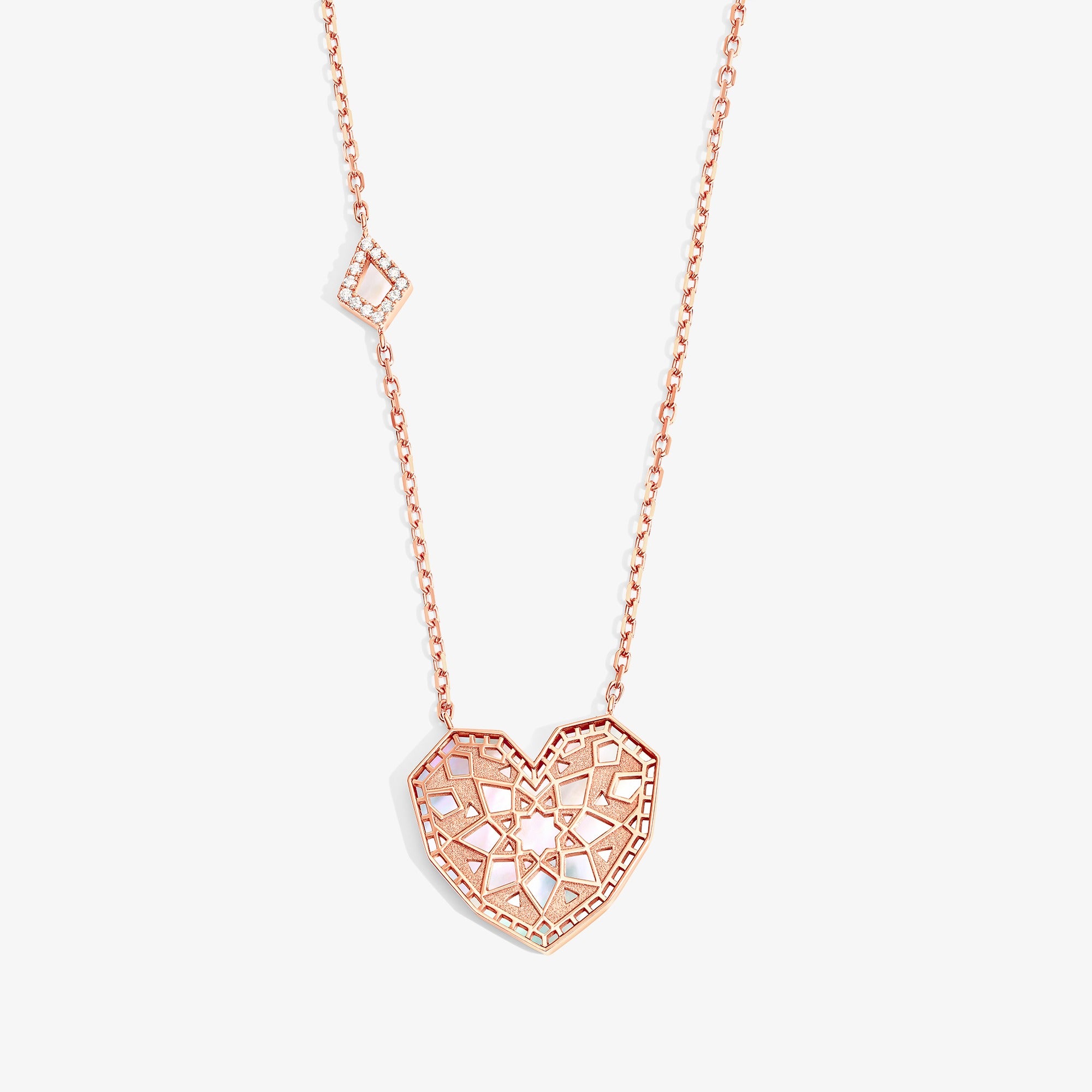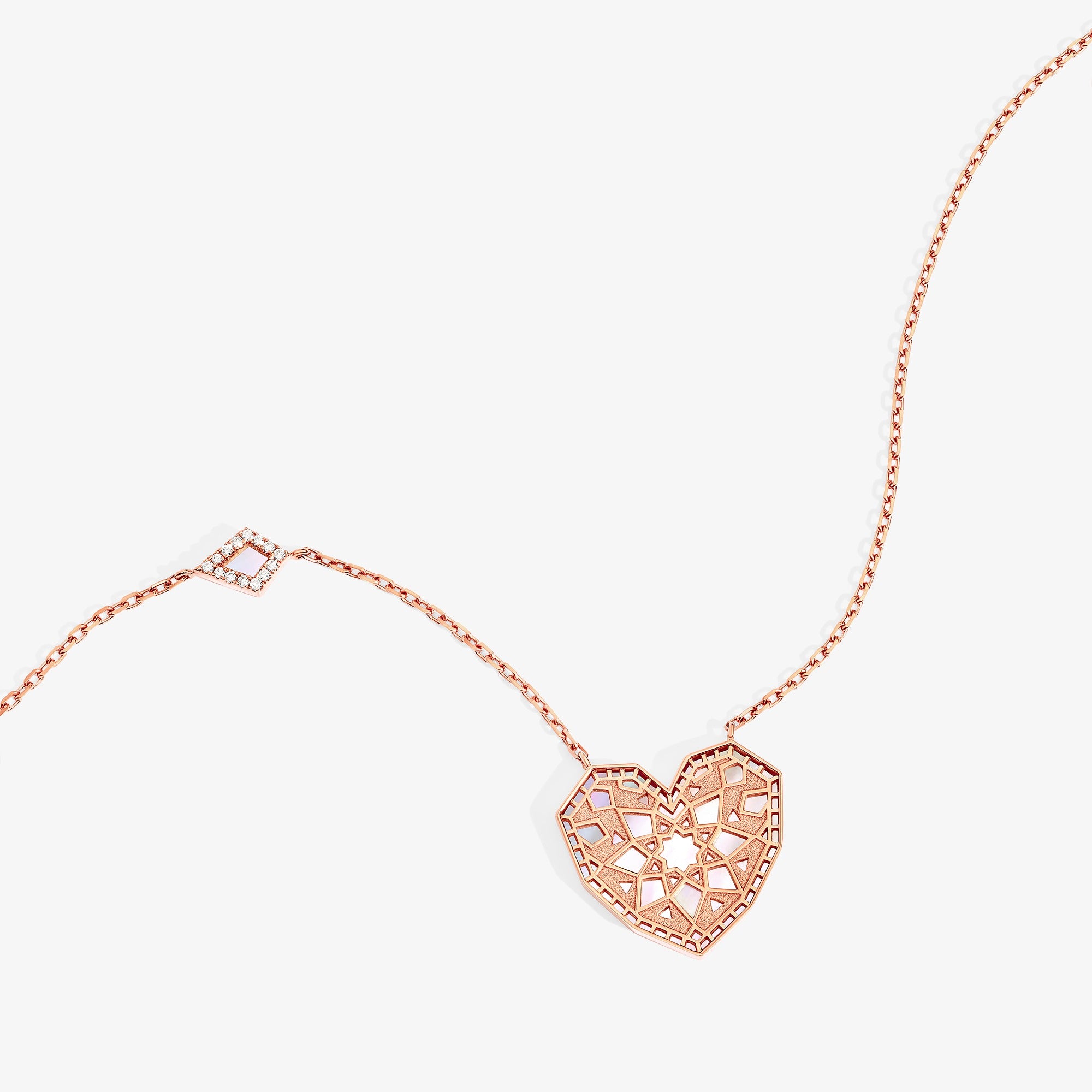 تعتمد مجموعة قلب تراث شكل القلب المستوحى من الأشكال المتشابكة والمترابطة التي تجسد إعادة إحياء الفولكلوروالتقاليد بطريقة عصرية. اكتشفوا فنّ التراث المتراكم من خلال مزج الأنماطالإيقاعية بالفنّ الهندسي عبر هذا العقد المتوسط الحجم من مجموعة قلب تراث المصنّع يدوياً من الذهب عيار 18 قيراط، والمرصّع بعرق اللؤلؤ والماسات اللمّاعة