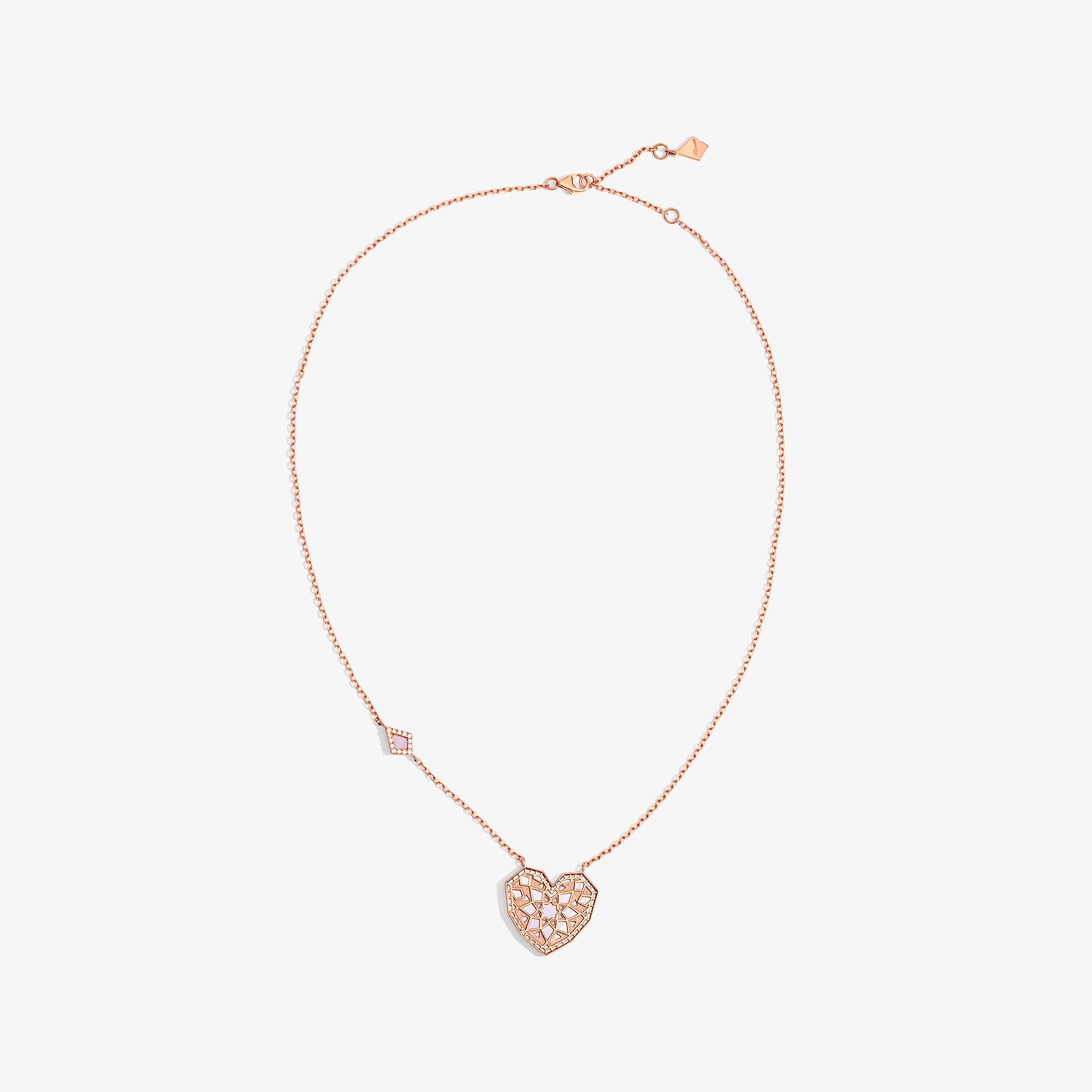 صُمّم هذا العقد المتوسط الحجم من الذهب الزهري عيار 18 قيراط، ومن عرق اللؤلؤ، والماسات اللماعة عيار 0.06قيراط، وله سلسلة بطول 42 سم، وهو من صنع الإمارات العربية المتحدة