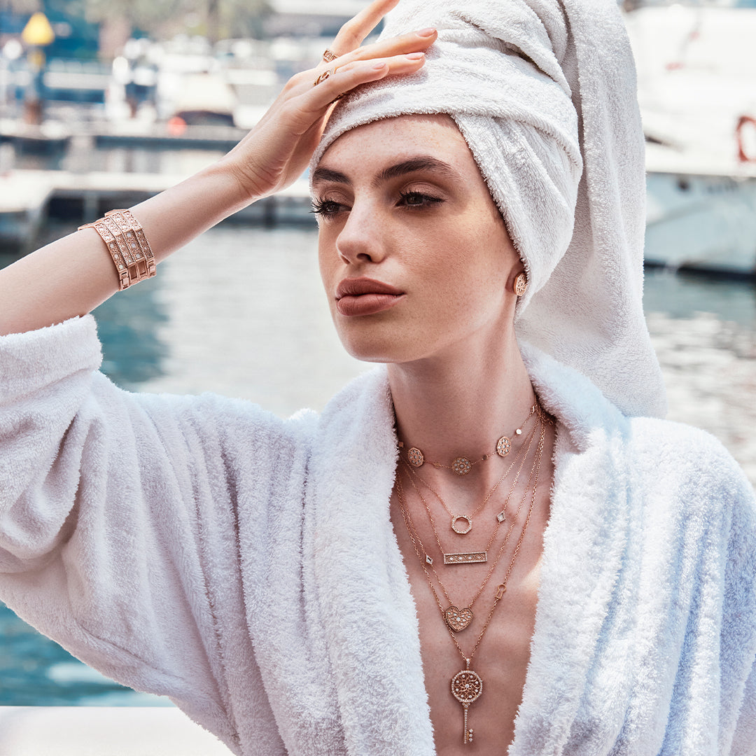 فيما ترخي الشمس بظلالها، وترسل أشعتها البراقة الذهبية، تضفي وهجاً منقطع النظير على كل ما حولنا،فنشعر بالتجدد والحيوية والطاقة. فالصيف هو موسم الدفء والفرح والاحتفال، موسميدعونا لاحتضان الحياة بكل وهجها وجمالها. وفي سمره، نؤمن بأن المجوهرات ليست مجردإكسسوار، بل هي تعبير حقيقي عن الروح، ومرآة تعكس الجمال المحيط بنا. ومن هنا،ندعوك سيدتي هذا الصيف، لتدللي نفسك وتتأنقي متزينة بمجموعاتنا المميزة، تراث،قوة، ونور، فتعزّزي نورك الداخلي ليتألق ويشع أشد قوة وسطوعاً من وهج الشمسوجمالها.