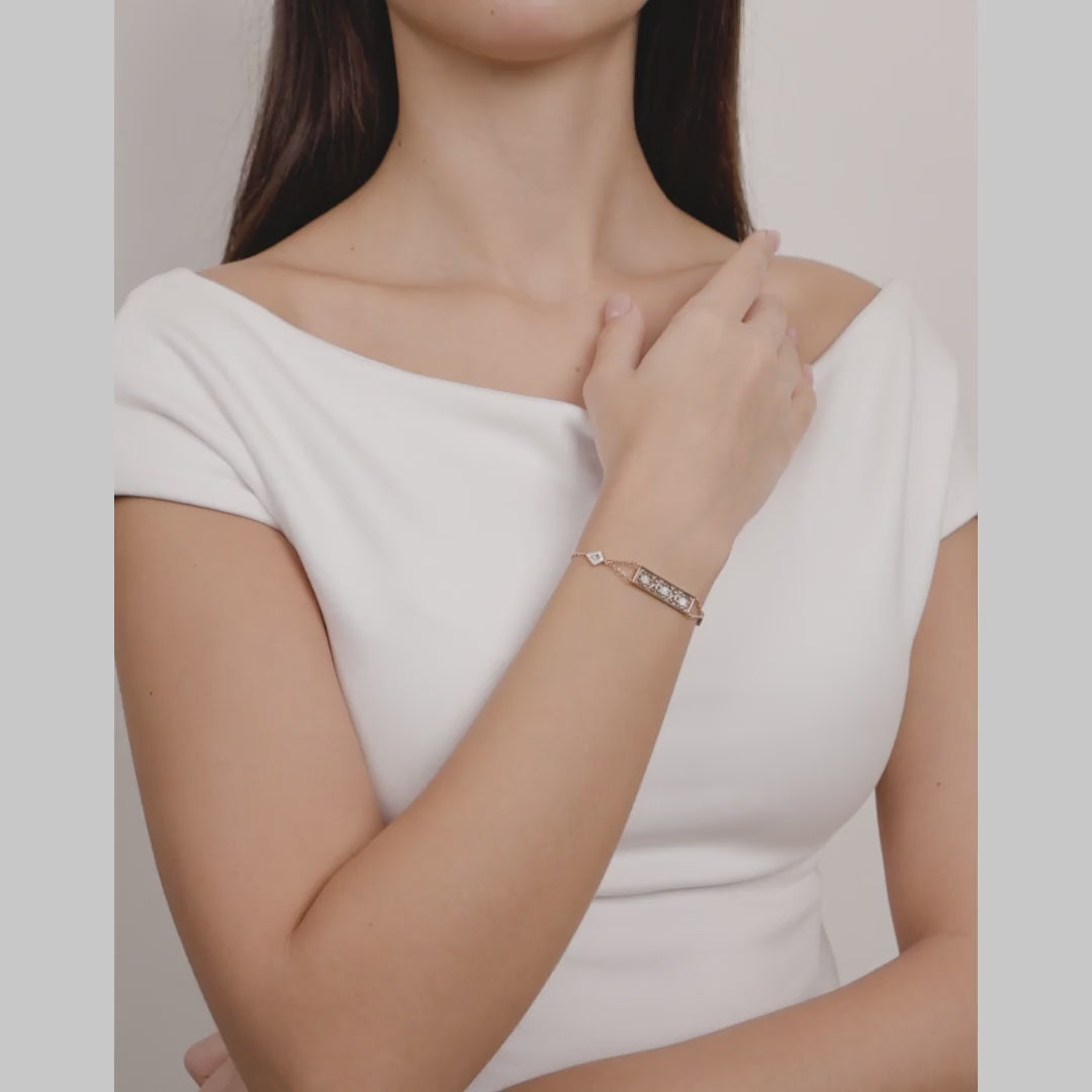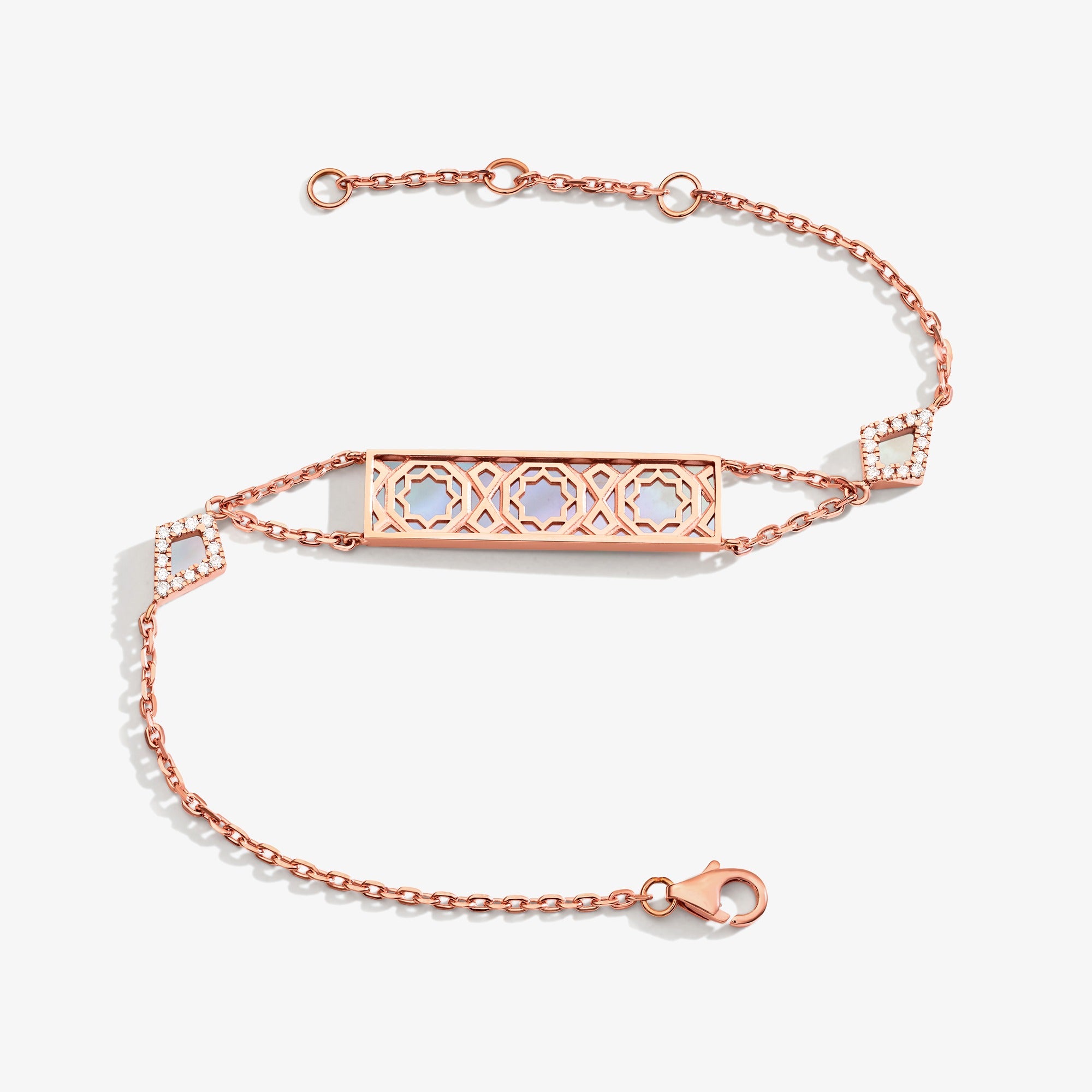 صُمّم هذا السوار من الذهب الزهري اللون عيار 18 قيراط، ومن عرق اللؤلؤ، ومن الماسات اللماعة عيار 0.07قيراط، وله سلسلة بطول 17.5 سم، وهو من صنع الإمارات العربية المتحدة
