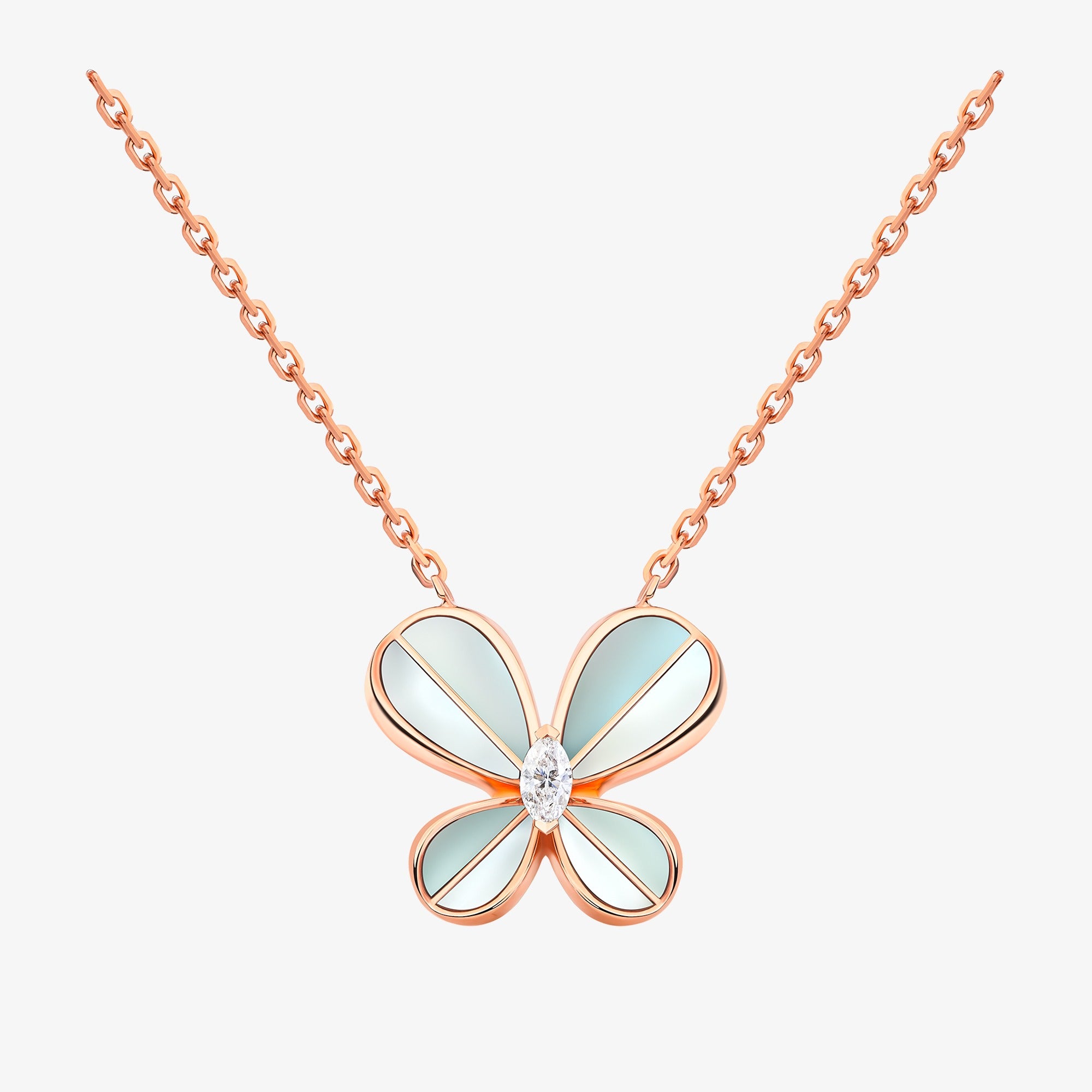 18k rose gold handcrafted with mother of pearl and a marquise cut diamond. This is from the Marquise Butterfly collection designed by Roaa al Sabban for Samra.