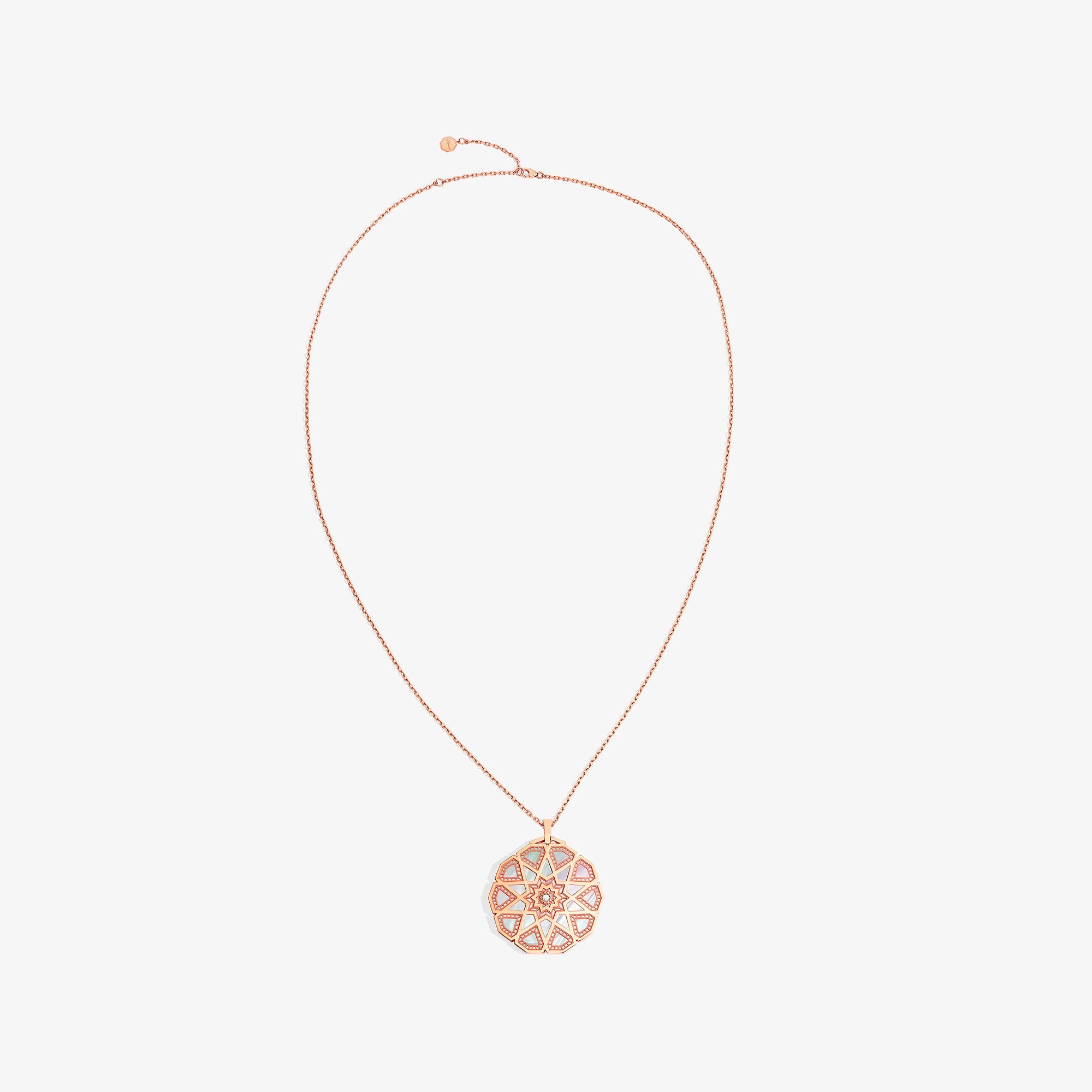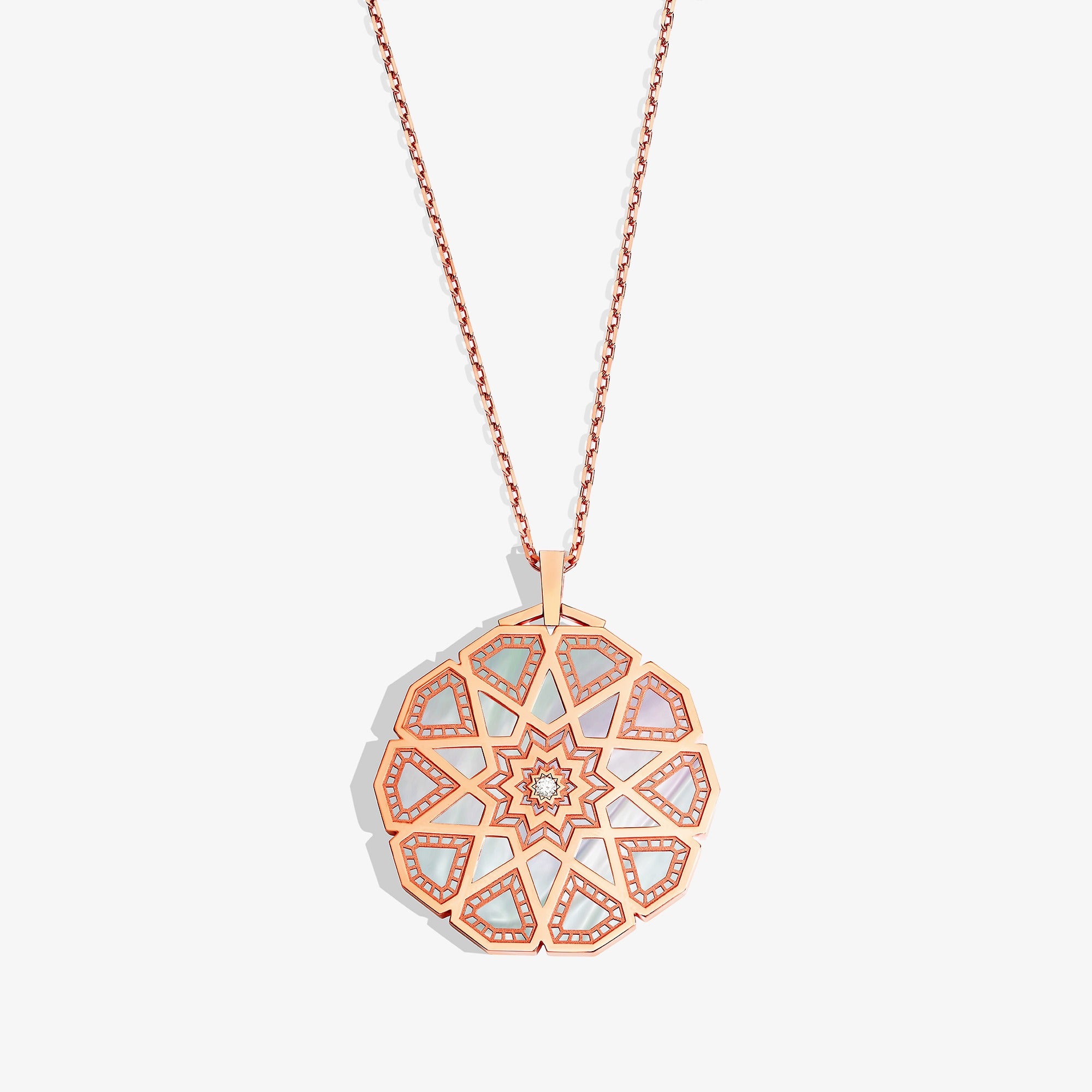 Inspired by regional art depicting history and heritage. The Turath Collection is a reinvention of classic artistry and a modern representation of transcribed art and geometry. Discover the Classic Turath Medallion Necklace in 18K Rose Gold set with Mother of Pearl inlay and Diamonds. Complete the look with stacking this Turath Medallion Necklace with other pieces from Turath Jewellery in the "Art of Stacking Turath."