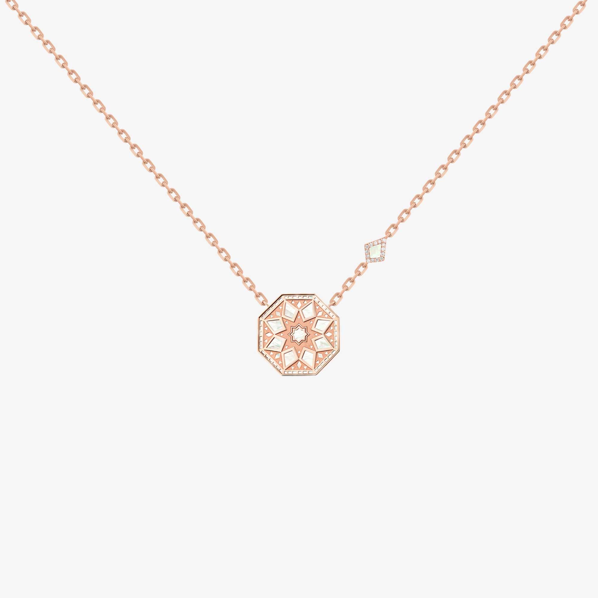 Inspired by regional art depicting history and heritage. The Turath Collection is a reinvention of classic artistry and a modern representation of transcribed art and geometry. Discover the Classic Turath Small Necklace in 18K Rose Gold set with Mother of Pearl inlay and Diamonds. Complete the look with stacking this Turath Necklace with other pieces from Turath Jewellery in the "Art of Stacking Turath."