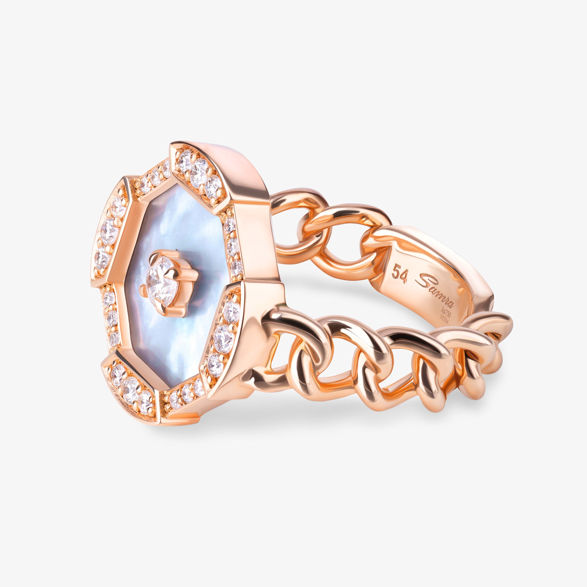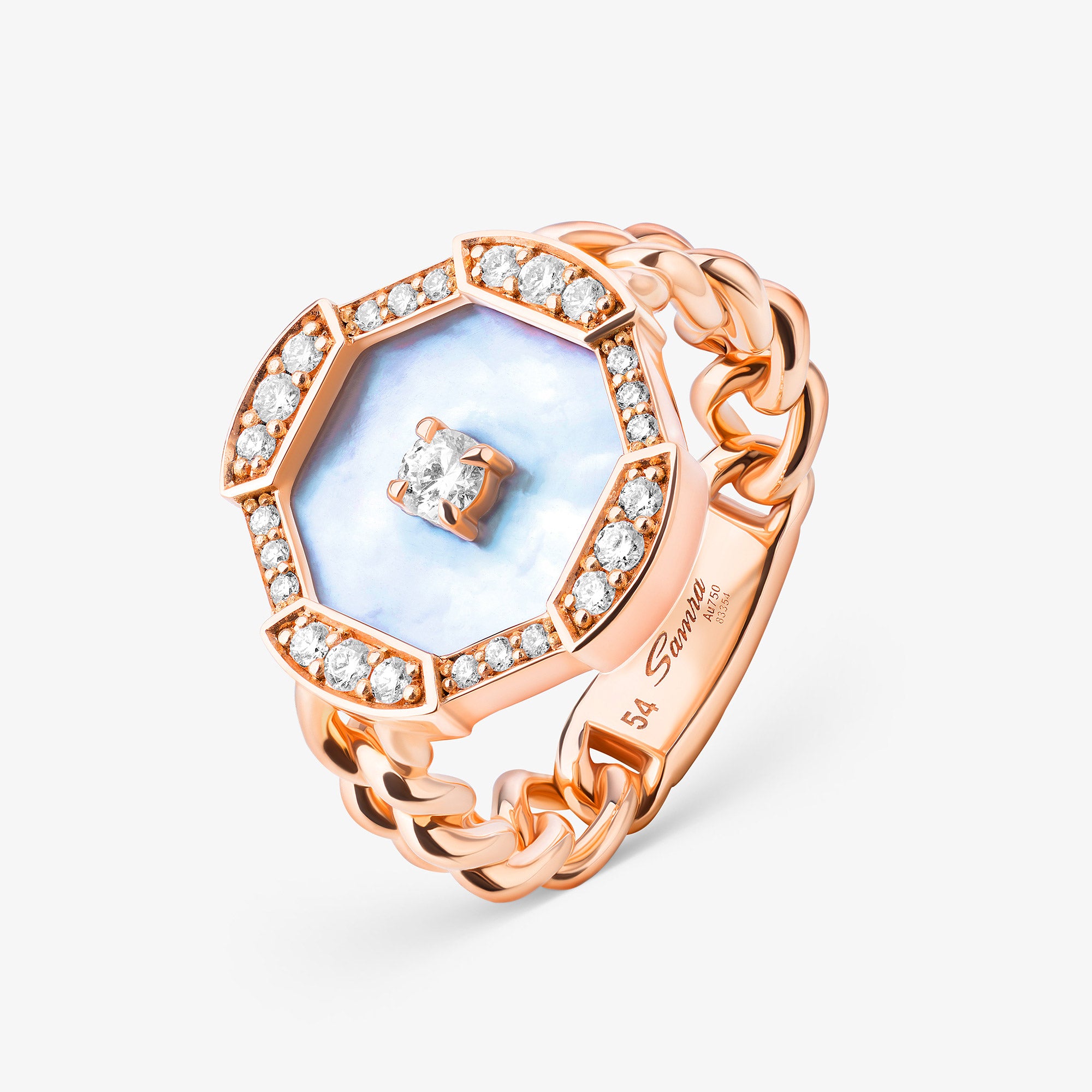 An evolution of strength, Quwa Motif emerges as a bold new chapter, magnifying the spirit of Quwa through a striking geometric motif crafted from mother of pearl and luminous diamonds, suspended from the iconic Samra rose gold link chain.
