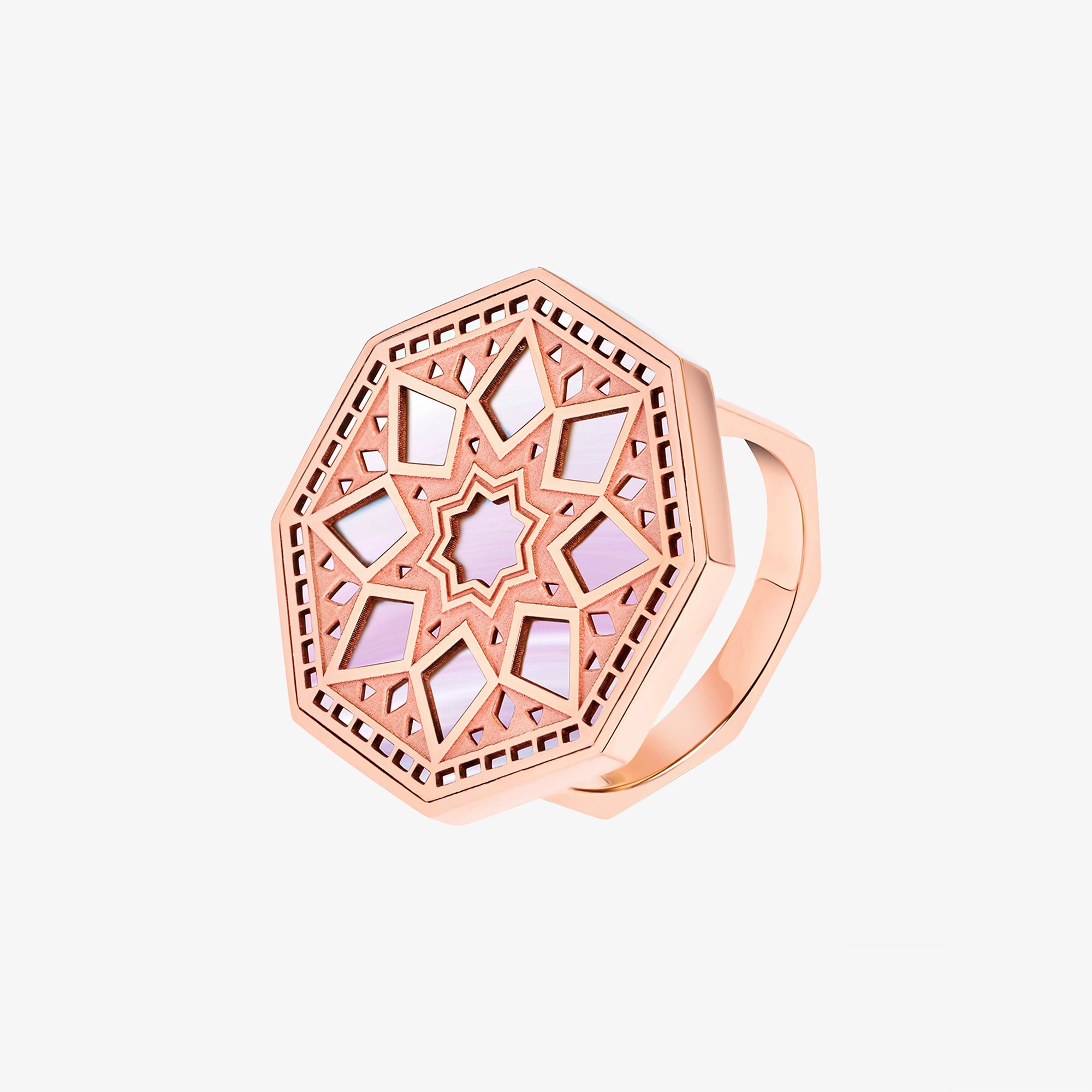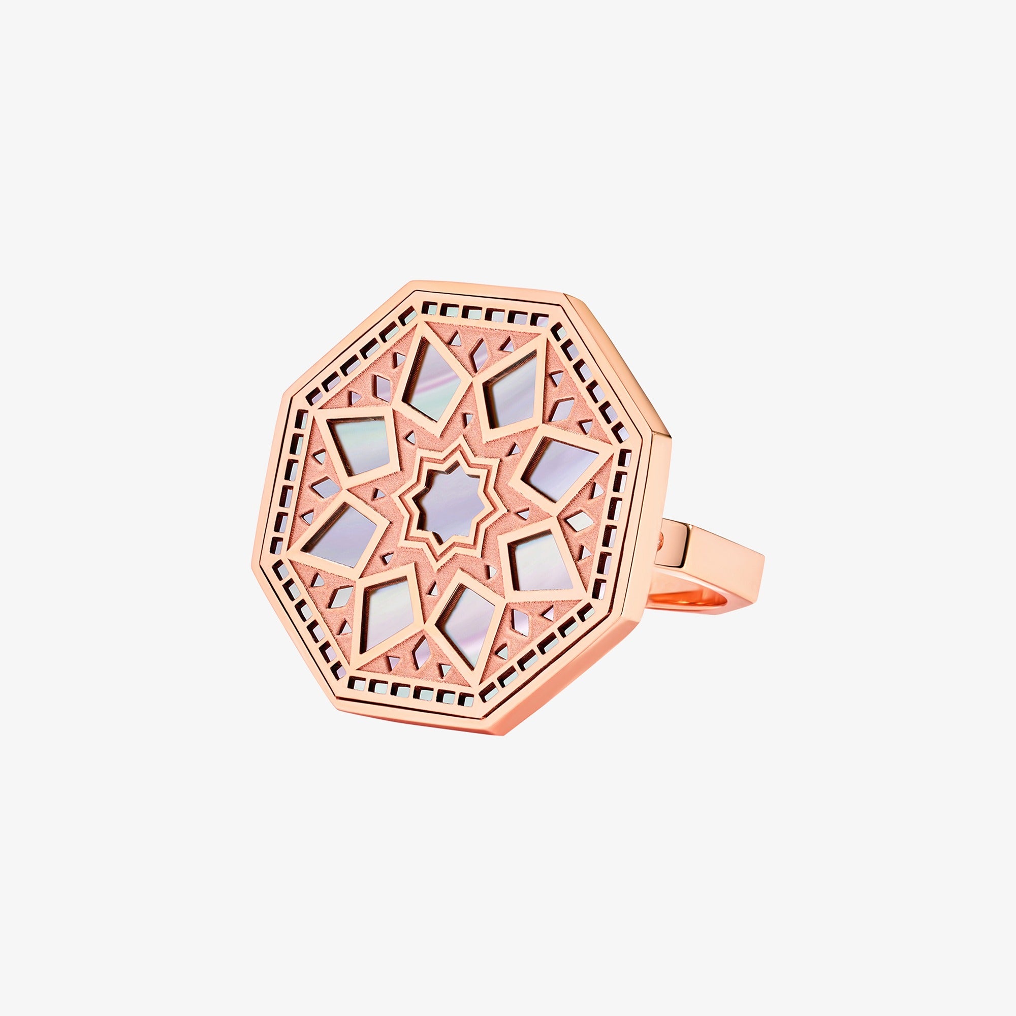 Inspired by regional art depicting history and heritage. The Turath Collection is a reinvention of classic artistry and a modern representation of transcribed art and geometry. Discover the Classic Turath Large Ring in 18K Rose Gold set with Mother of Pearl inlay and Diamonds. Complete the look with stacking this Turath Ring with other pieces from Turath Jewellery in the "Art of Stacking Turath."