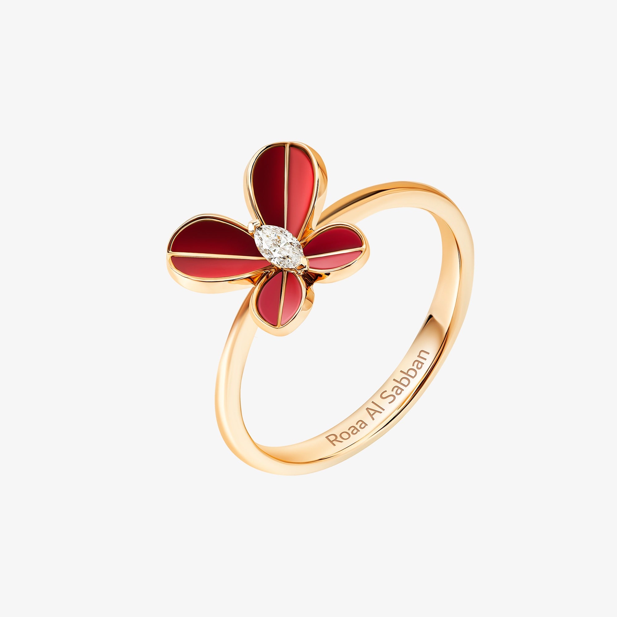 18k rose gold handcrafted with coral stone and a marquise cut diamond. This is from the Marquise Butterfly collection designed by Roaa al Sabban for Samra.