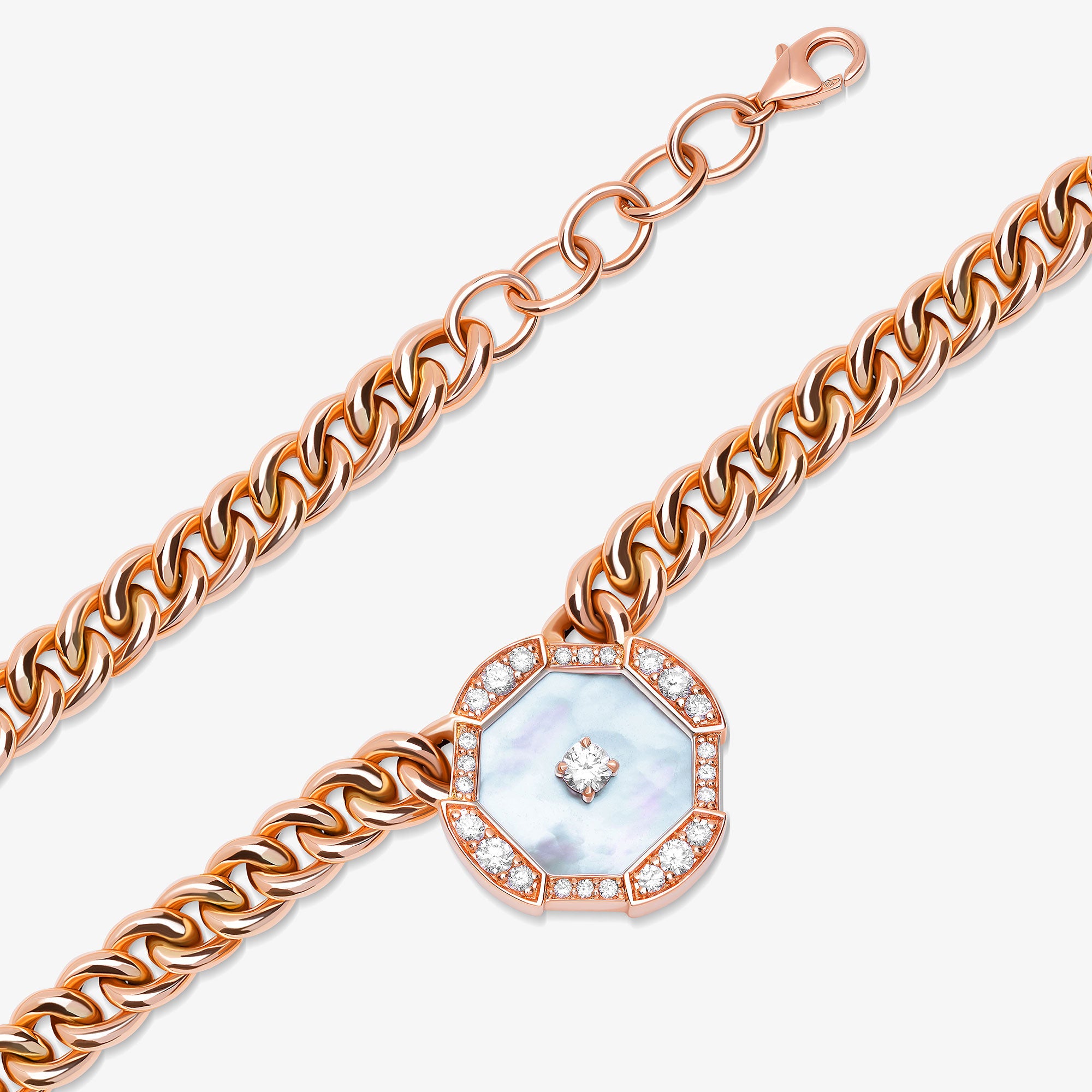 An evolution of strength, Quwa Motif emerges as a bold new chapter, magnifying the spirit of Quwa through a striking geometric motif crafted from mother of pearl and luminous diamonds, suspended from the iconic Samra rose gold link chain.